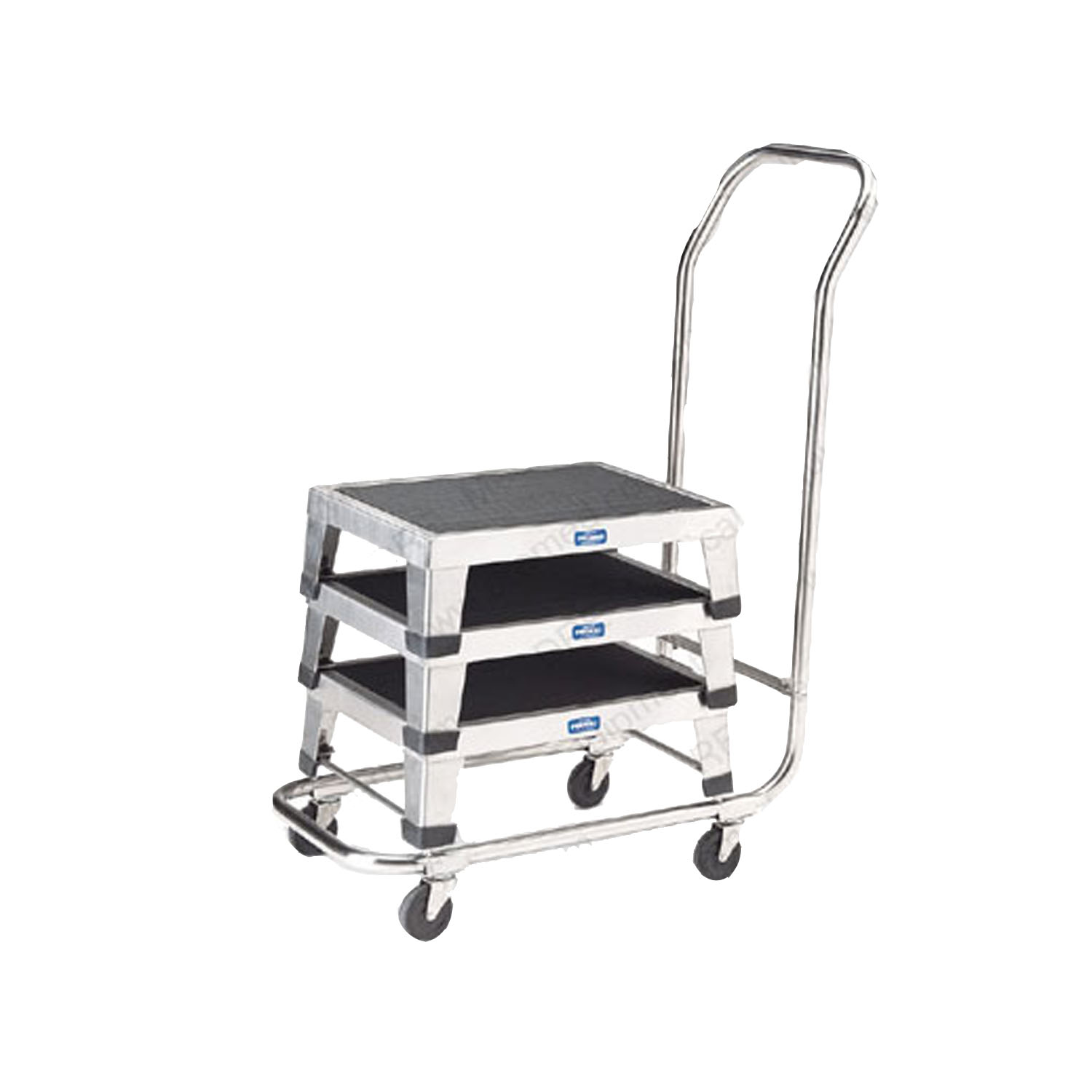 The optional transport cart holds up to six stools and rolls between departments on 3-inch swivel casters. Bottom line: you get the versatility of multiple step heights without the storage headache of buying separate fixed platforms.