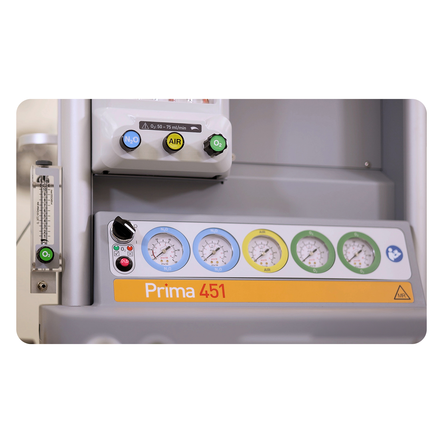The Prima 451 operates safely within 3.0 Tesla MRI environments up to the 1,000 gauss line, delivering full anesthesia capability where most machines can’t go.