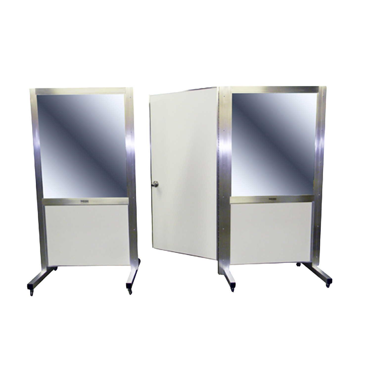 Mobile simulation screens with two-way mirror observation capability. Units connect to form temporary control rooms and nest for compact storage when not in use.